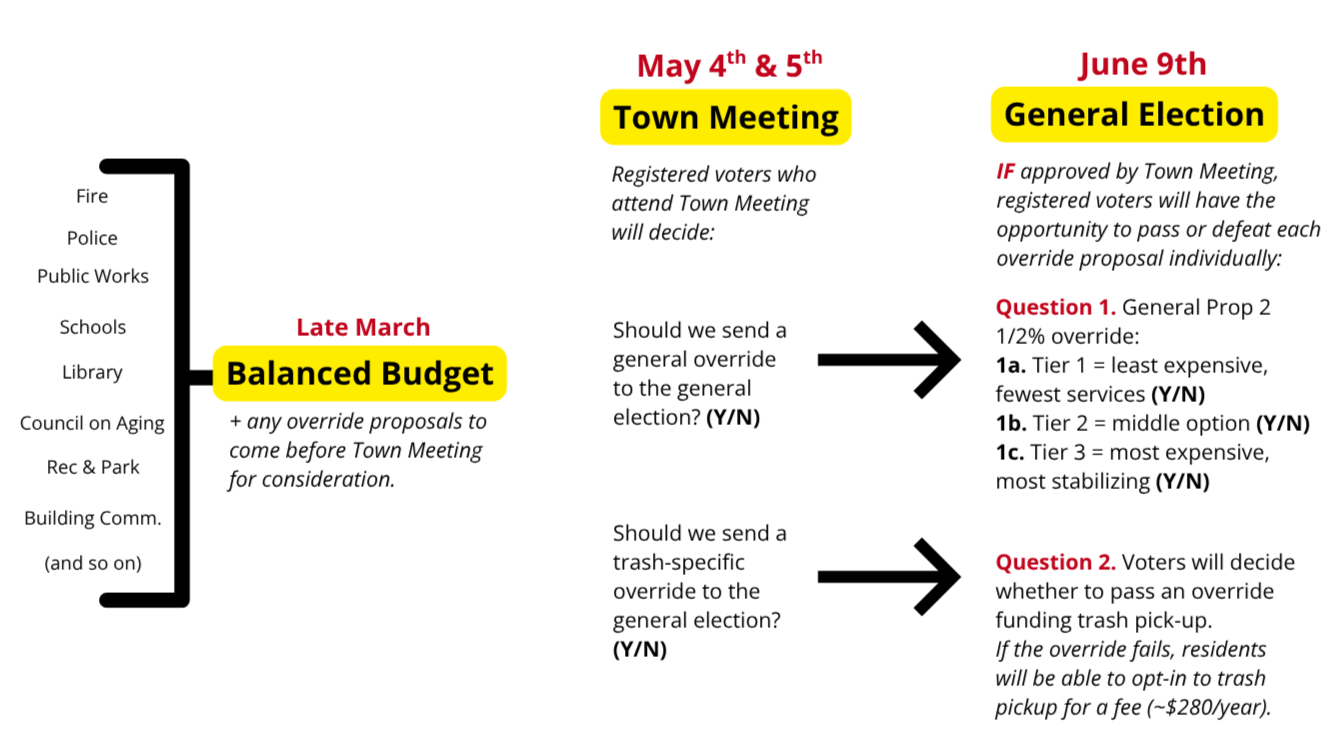 Now, town leaders are working to define the specific costs and service levels for each of the proposed override tiers. We are looking for them to share associated tax levy increases for public comment and review before Town Meeting on May 4.