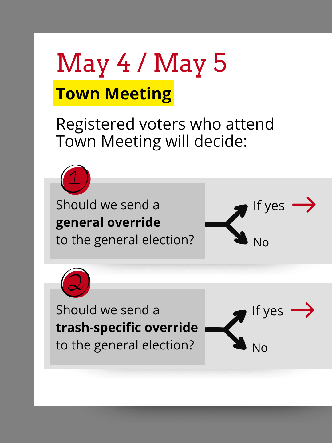 2) MAY 4: Town Meeting votes on whether to place the override(s) on the ballot - a simple YES or NO vote.