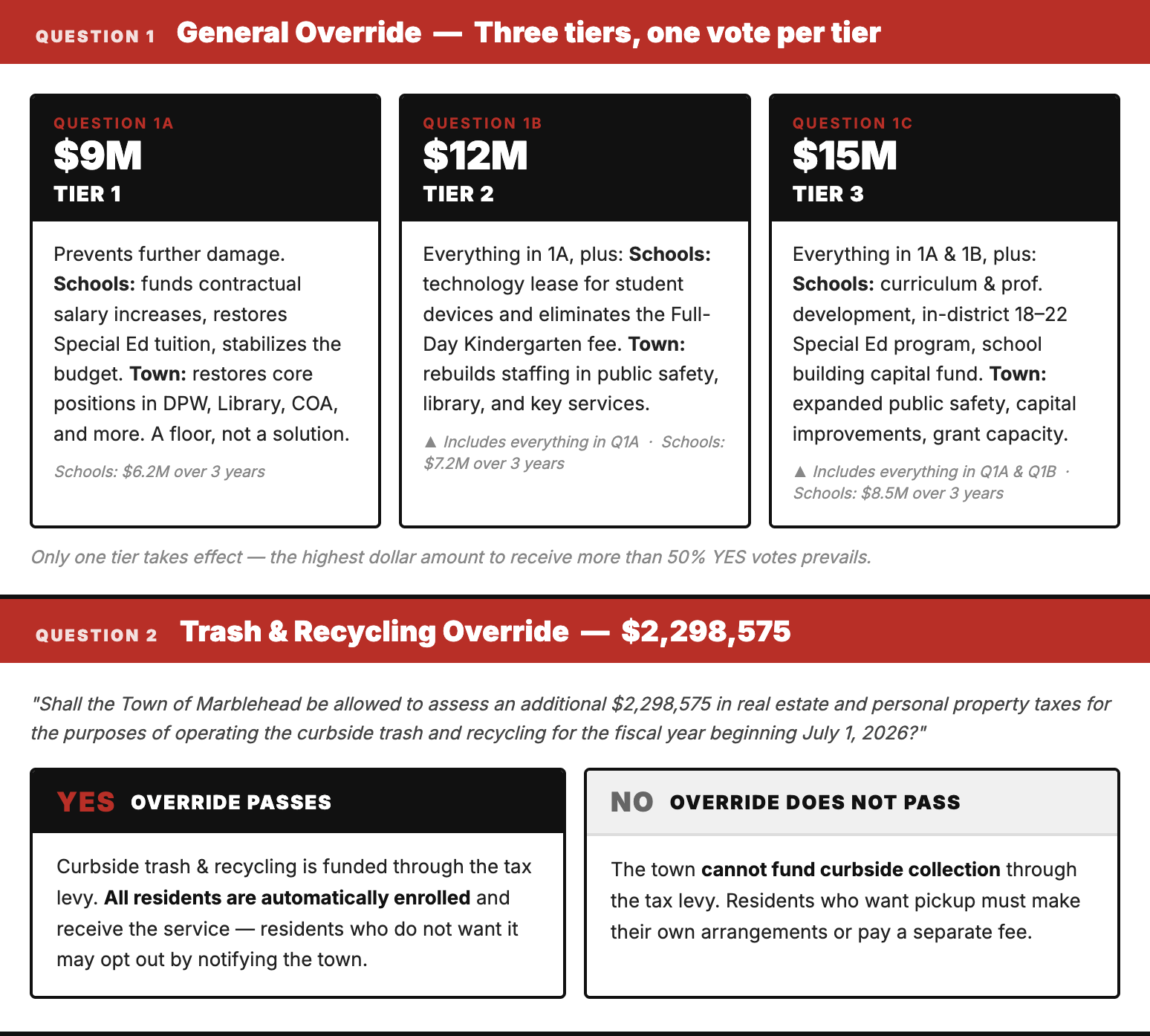 There will be two override questions at Town Meeting:Question 1 will comprehensively cover all municipal services and the schools (excluding curbside trash collection) - this is what For Marblehead has advocated for.