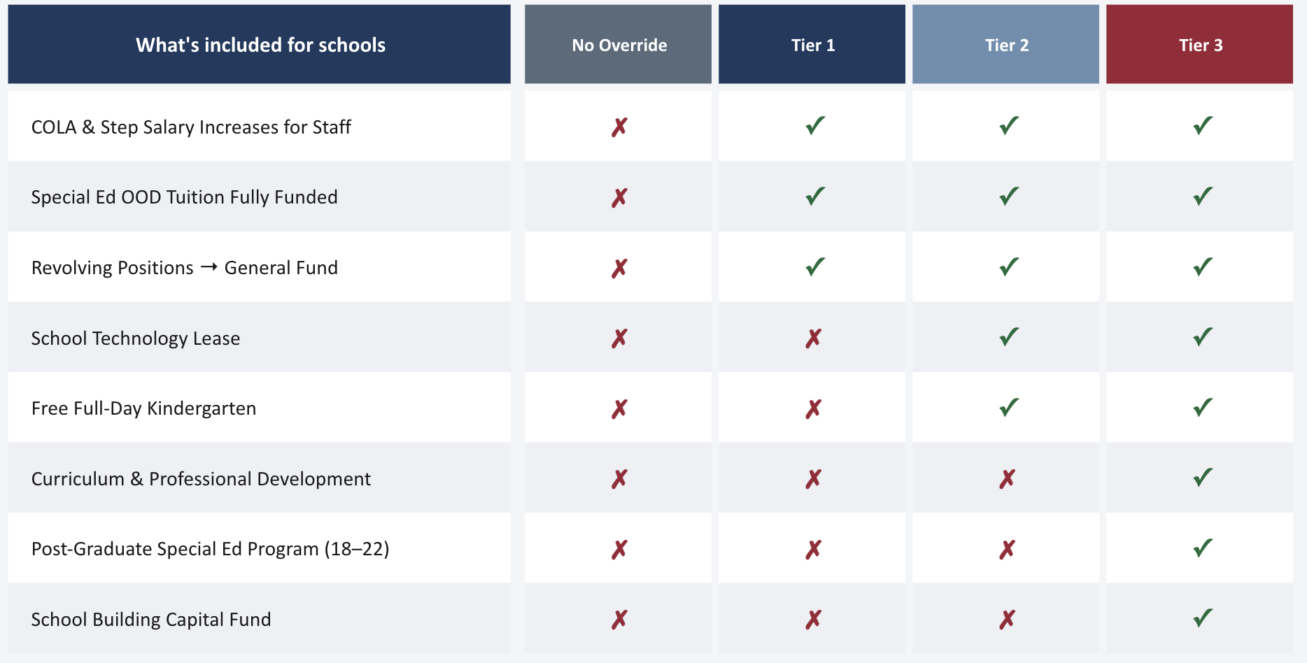 This page explains the latter: the general override which would fund schools, services, and infrastructure.