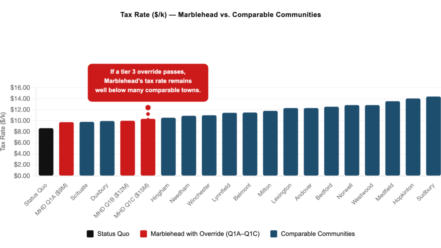 Marblehead's current tax rate is $8.65 per $1,000 of assessed value. Here's how each override tier would position Marblehead relative to 16 similar communities.